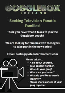 Seeking Television Fanatic Families Gogglebox Ireland are currently casting for families for the new series on Virgin Media this autumn. They are on the lookout for new families with teenage kids - ideally 13/14 upwards. Think you have what it takes to join the Gogglebox Couch? Email: casting@kiteentertainment.com A bit about yourself Your contact number Who's in your gang? Where are you based? What do you like to watch together? Please share a photo of your gang together